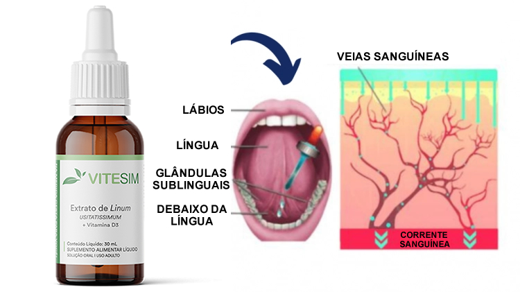 A forma de usar o ViteSim é sublingual, debaixo da língua, onde tem vasos que levam direto para o sangue.
